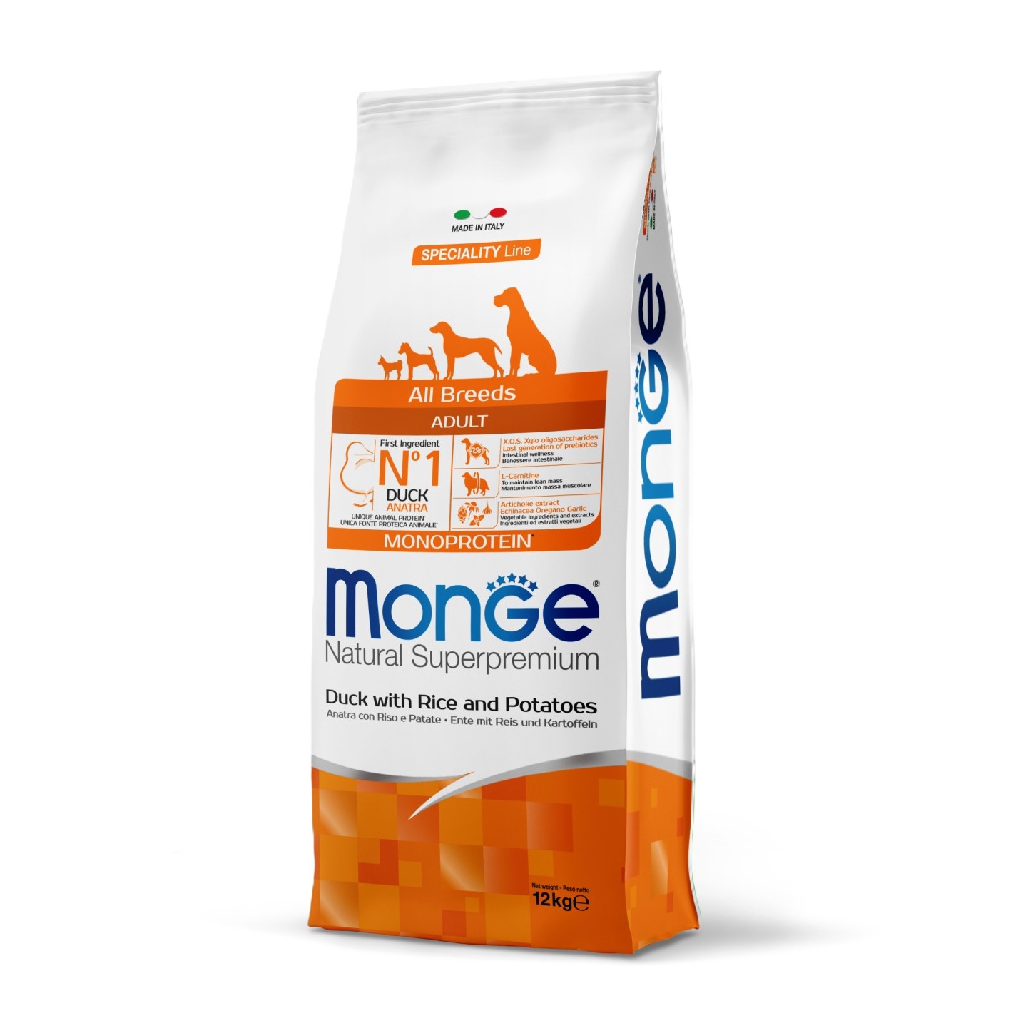 מונג’ | מזון לכלב בוגר – ברווז, אורז ותפו”א | 12 ק"ג