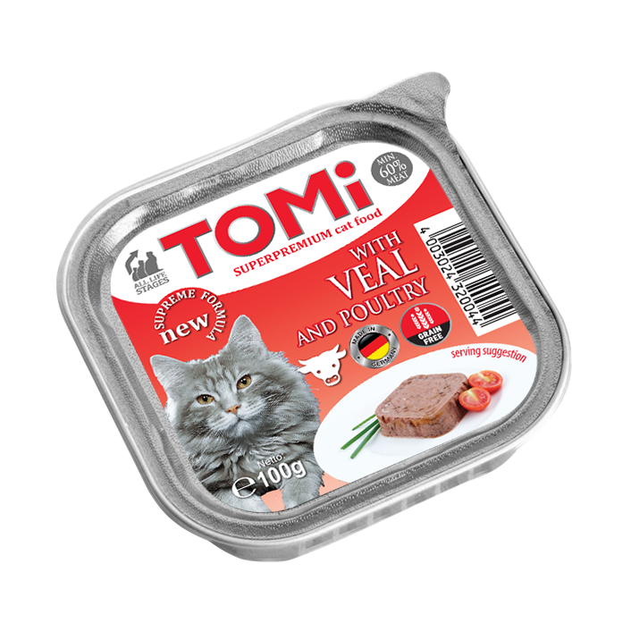 48 יח’ טומי – מעדן עגל ועוף – פטה לחתול | 100 גר’